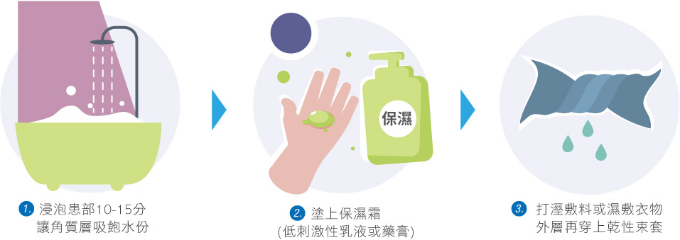 濕敷療法主要是舒緩皮膚,並且長時間維持皮膚的保濕狀態。如果平日有勤著做這類的保養,有助於延長每一次肌膚不適發生的頻率及嚴重程度。它的操作其實很簡單: 浸泡患部10-15分讓角質層吸飽水份→塗上保濕霜(低刺激性乳液或藥膏)→使用濕敷敷料或濕敷衣物,記得要再穿上乾性束套,才能保持敷料的濕潤。常見的操作時間多數在2-8小時之內,若是濕敷的時間大於2小時以上,建議每兩小時檢查和補充內層的溼度。