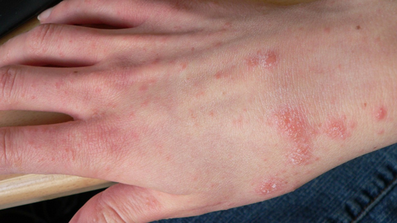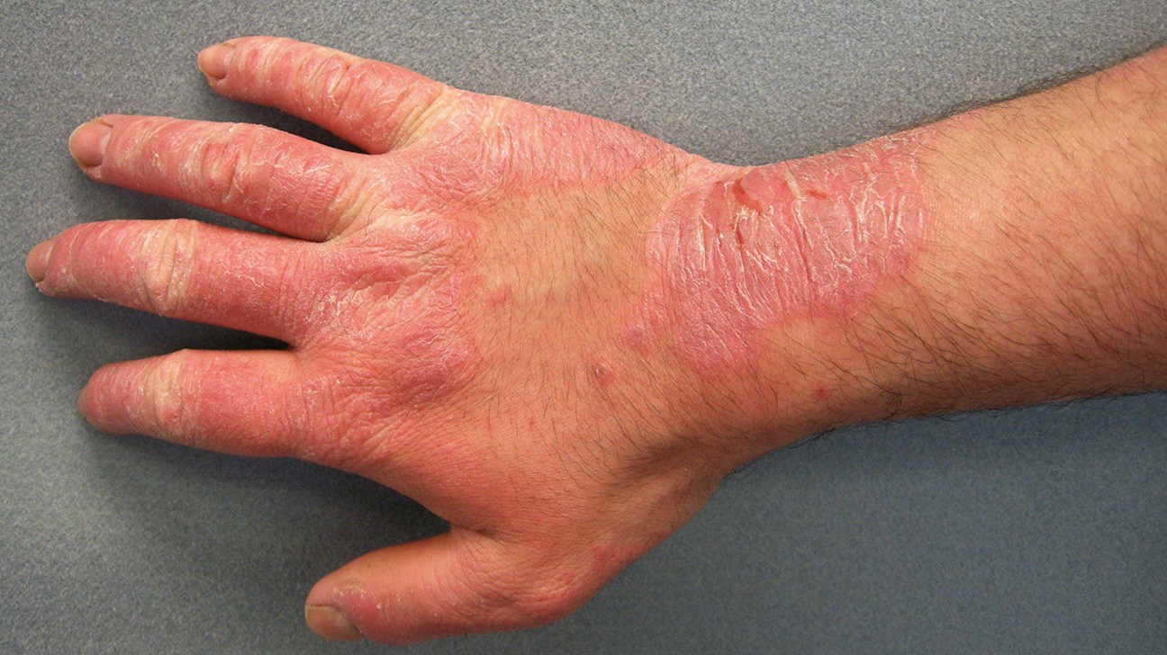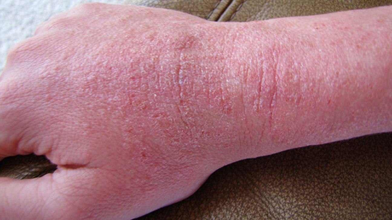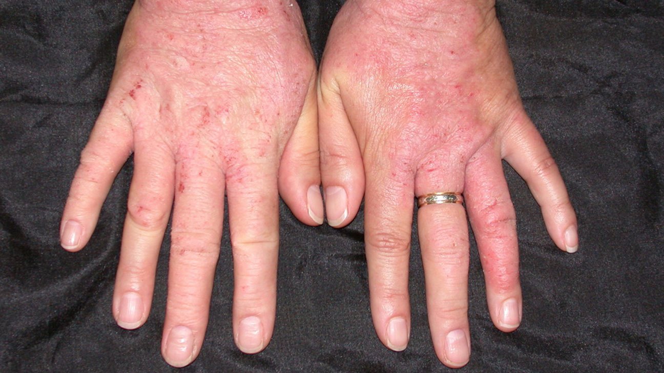 可能類似於在手和前臂上發現的燒傷皮膚皮膚瘙癢,紅色,鱗片或生苔,滲出或變成硬皮。
