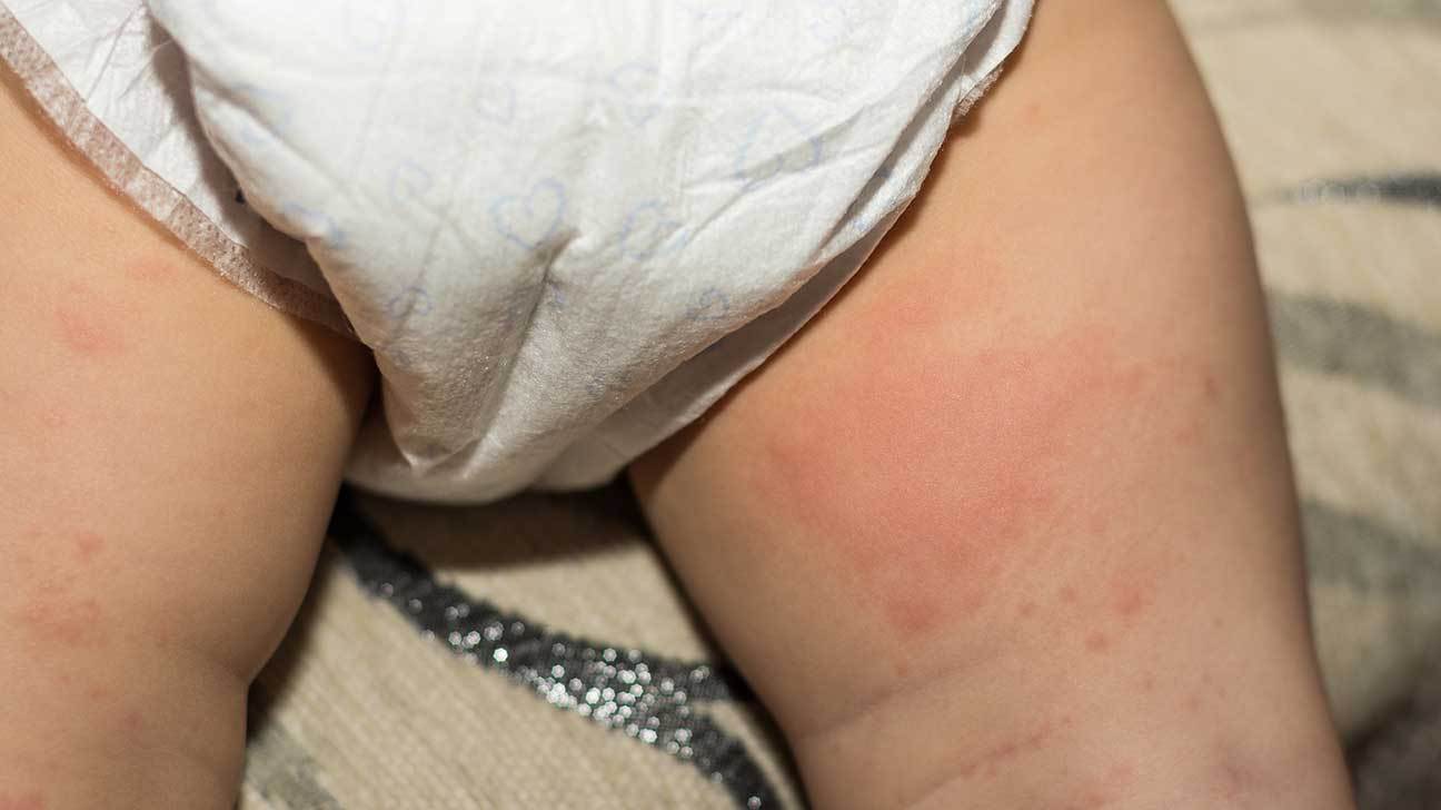 皮疹位於與尿布接觸的區域,皮膚看起來紅,潮濕,有刺激性,溫暖的觸感