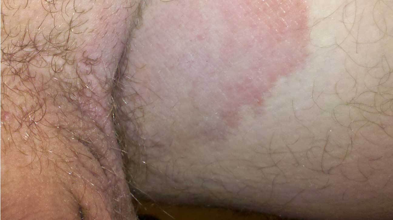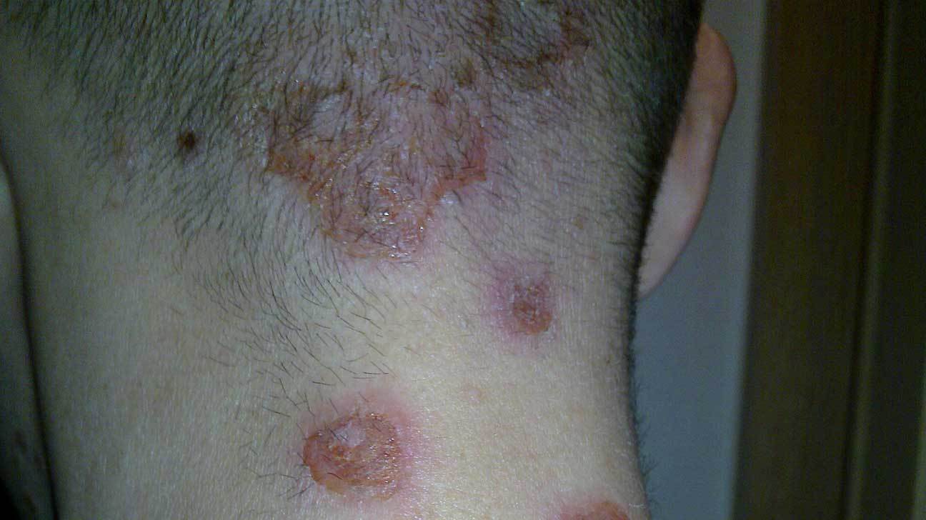 開始出現搔癢,刺痛和紅色皮疹,外觀濕潤,邊緣乾燥結痂