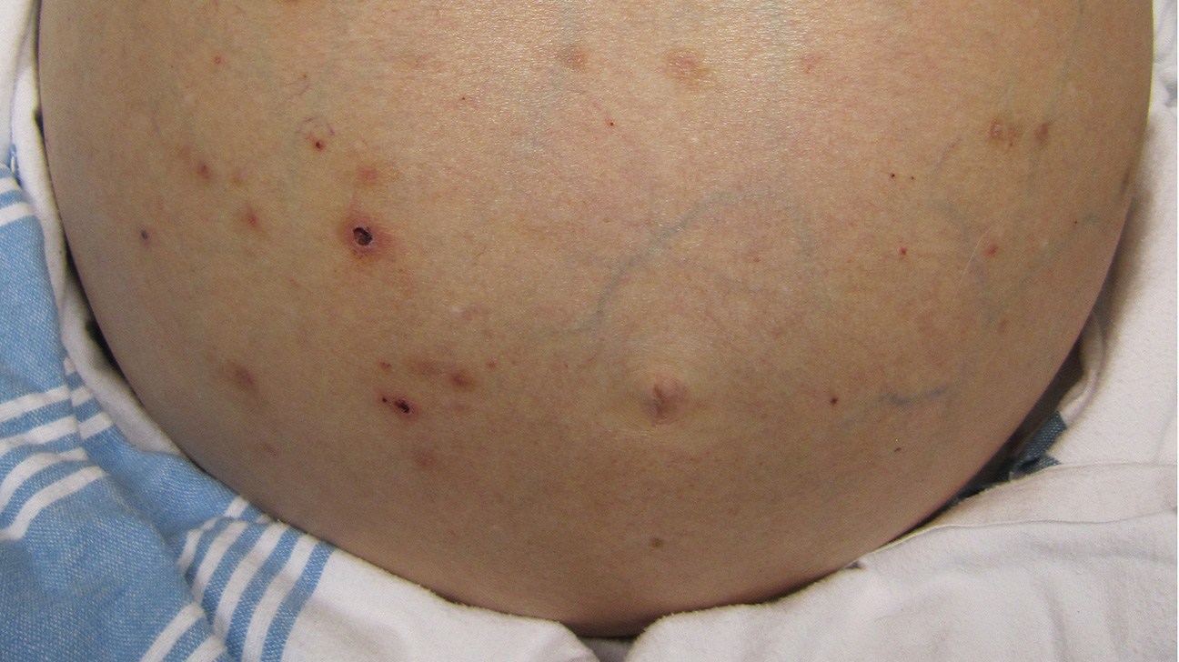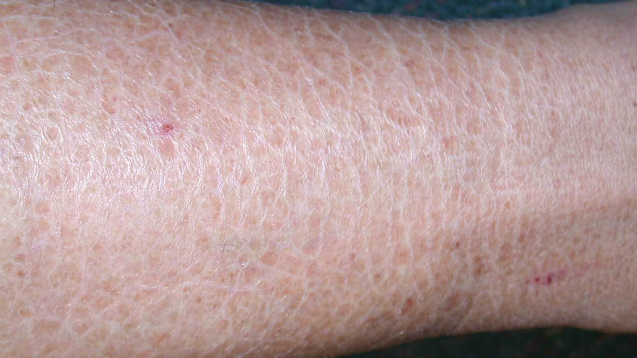 脫屑,瘙癢和均裂,最常見於腿部,手臂和腹部