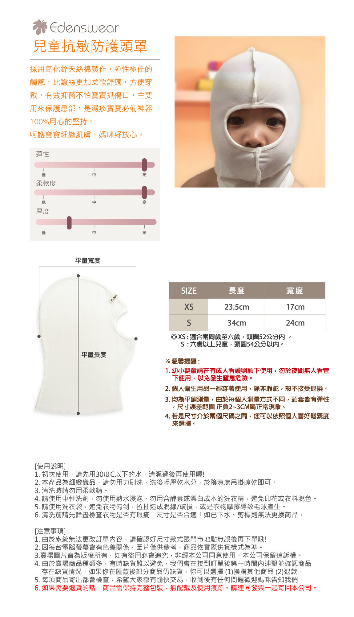 {鋅健康抗敏系列} 頭套採用高級的超細天絲材料,有著細緻的觸感,含有高純度氧化鋅,有效抑制金黃色葡萄球菌。有卓越的肌膚養護功能 主要用來保護患部防止搔抓,是濕疹寶寶必備神器 XS適合2周歲至六歲頭圍52公分內 S 6歲以上兒童頭圍54公分以內 商品成分:74% 萊賽爾 18% 萊賽爾(氧化鋅) 8% 彈性纖維 ※ 個人衛生用品,一經穿著使用,除非瑕疵,恕不接受退換。 ※幼小嬰童請在有成人看護下使用勿於夜間無人看管下使用以免發生窒息危險