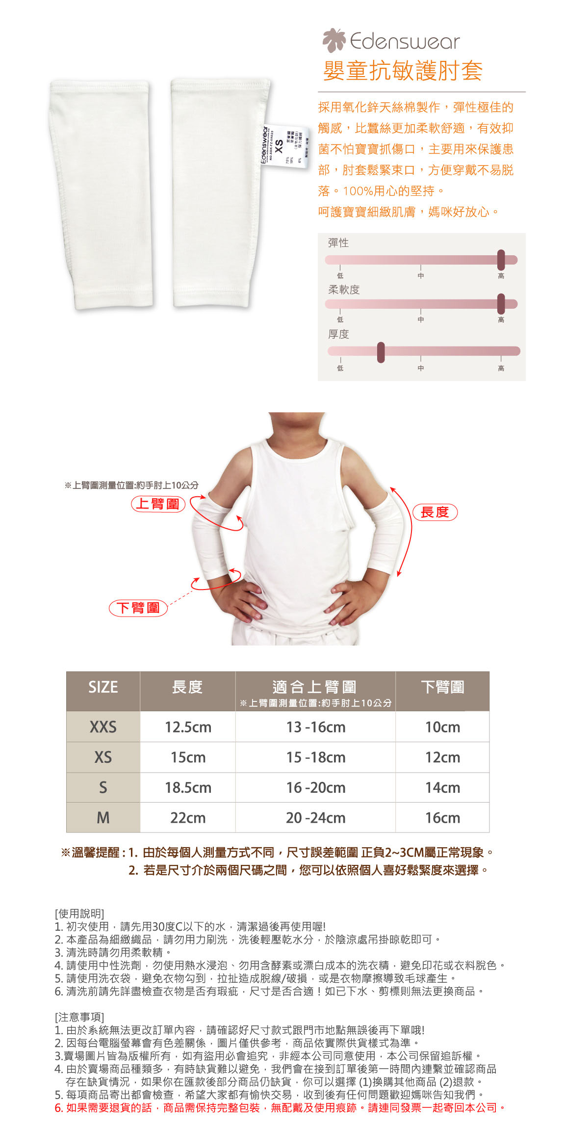 {鋅健康抗敏系列} 【產品特色】 肘套採用高級的超細天絲材料,觸感細緻。 含高純度氧化鋅,有效抑制金黃色葡萄球菌。 卓越的肌膚養護功能 異位性皮膚炎兒童手腳關節處容易起疹子發癢。用來防搔抓保護患部增強防禦力,是濕疹寶寶必備神器。 超彈性舒適,可用於乾、濕敷。 深色肘套第一次下水洗滌會略為掉色.請與白色衣物分開單獨手洗 德國專利耐水洗長久有效 商品成分:74% 萊賽爾 18% 萊賽爾(氧化鋅) 8% 彈性纖維 ※ 個人衛生用品,一經穿著使用,除非瑕疵,恕不接受退換。