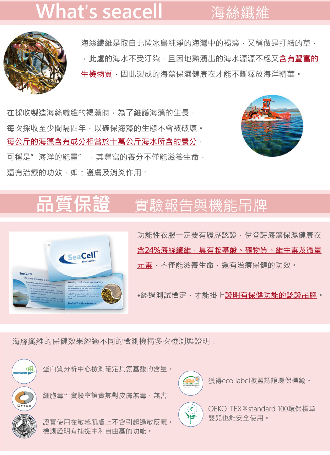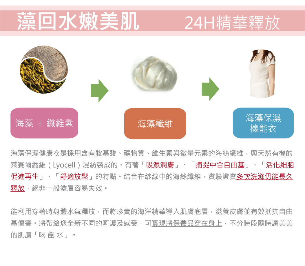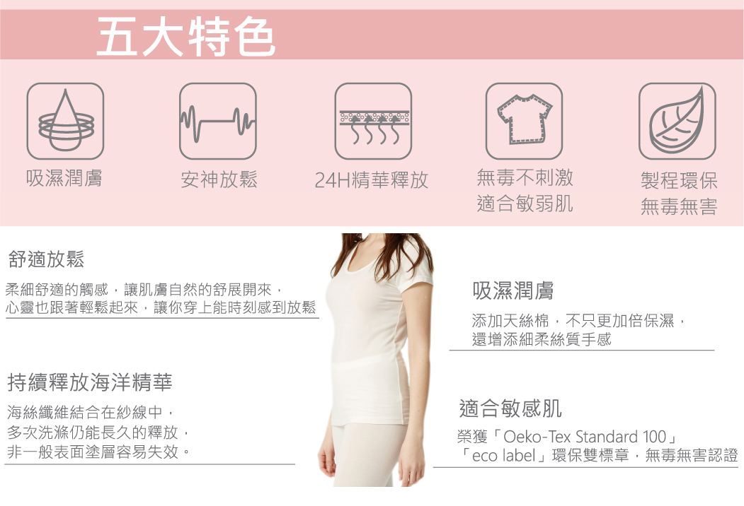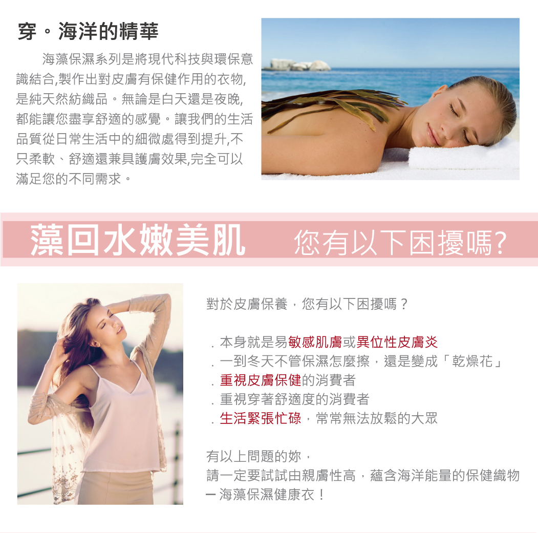 海藻纖維含豐富膠原蛋白吸濕潤膚,穿著時釋放微量礦物質維生素能中和有害自由基,使您感覺健康舒適安神放鬆,通過歐盟多項環保認證,天然無毒環保健康,嬰兒孩童都能安心使用。