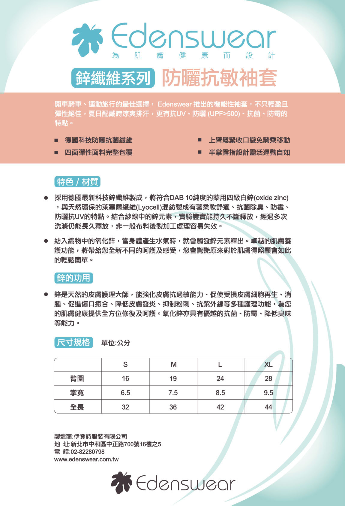 【產品特色】 袖套採用高級的超細天絲材料,有著細緻的觸感, 含高純度氧化鋅,有效抑制金黃色葡萄球菌。 卓越的肌膚養護功能。 經檢測防曬係數UPF>500,是夏季出門不可缺的單品。(使用AATCC 183-2010標準檢測) 黑色袖套第一次下水洗滌會略為掉色.請與白色衣物分開單獨手洗 德國專利耐水洗長久有效 商品成分:74% 萊賽爾 18% 萊賽爾(氧化鋅) 8% 彈性纖維