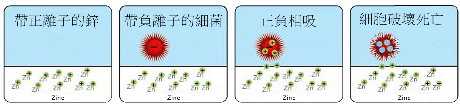 帶有正電荷的鋅離子接觸到帶負電荷的細菌或病毒時,正、負電荷不平衡的情況下產生拉力,導致細菌細胞壁被破壞,無法在合成細胞壁而影響細菌繁殖