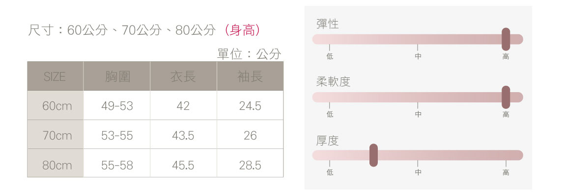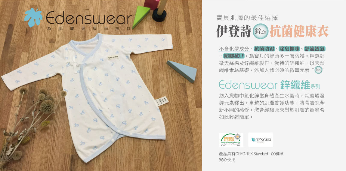 {鋅健康抗敏系列} 採用高級的超細天絲材料,有著比蠶絲更加細緻的觸感,含有10000ppm高純度DBA10四級氧化鋅,有著「柔軟舒適」、「抗菌除臭」、「防曬抗UV」的特點。有卓越的肌膚養護功能,能給寶寶百分百的呵護 商品成分:74% 萊賽爾 18% 萊賽爾(氧化鋅) 8% 彈性纖維