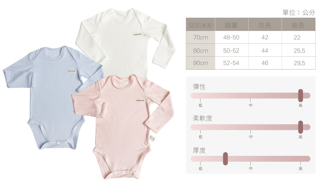 採用高級的超細天絲材料,有著比蠶絲更加細緻的觸感,含有10000ppm高純度DBA10四級氧化鋅,有著「柔軟舒適」、「抗菌除臭」、「防曬抗UV」的特點。有卓越的肌膚養護防禦功能,能給寶寶百分百的呵護,領口交叉設計好穿脫,下方鈕扣設計方便換尿布