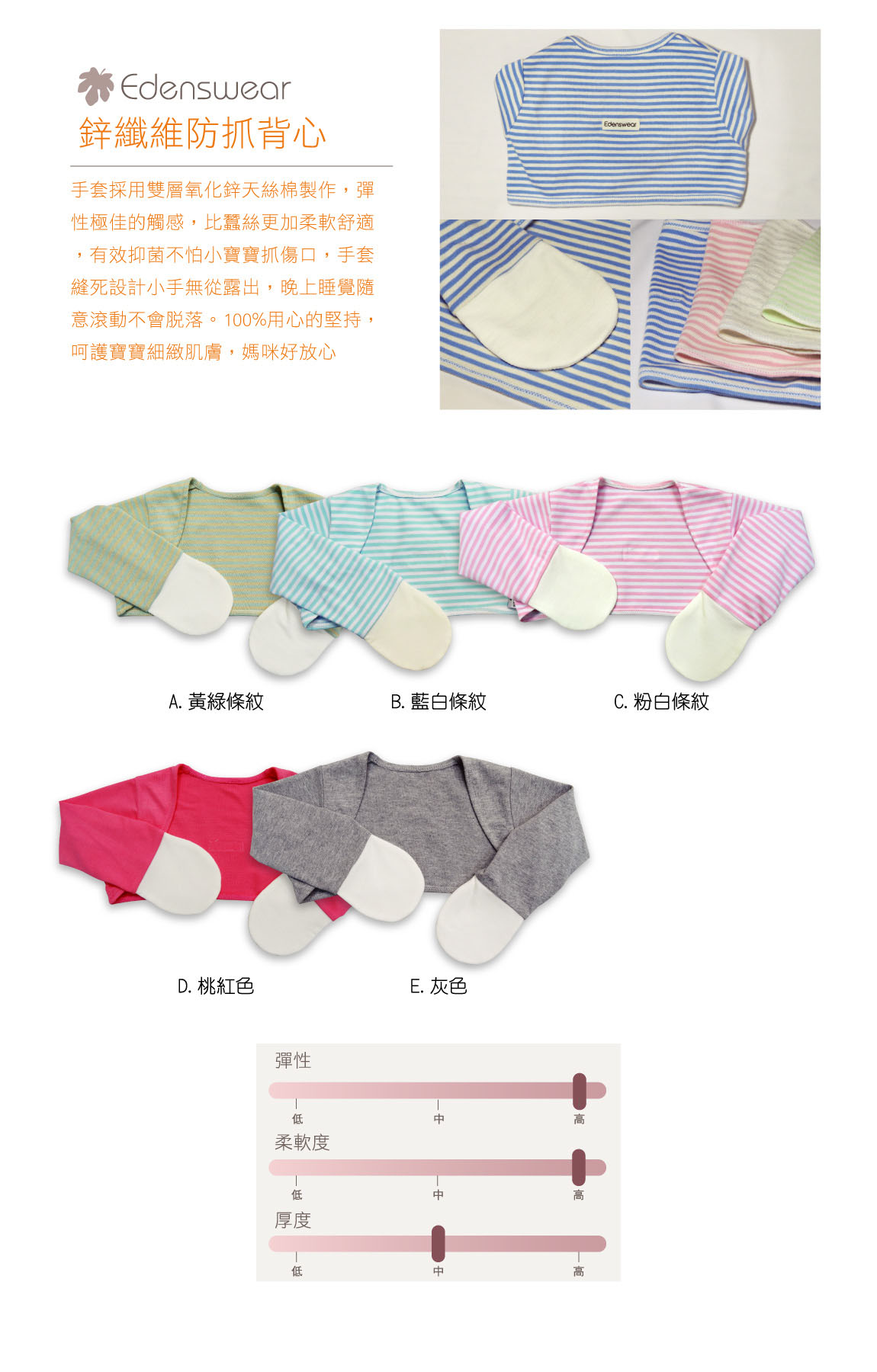 手套採用含氧化鋅的超細天絲製作材質細緻抗菌,不會摩擦抓傷寶寶臉部皮膚,背心純棉設計舒適透氣多種顏色選擇,背心式設計防止傳統手套因滾動脫落